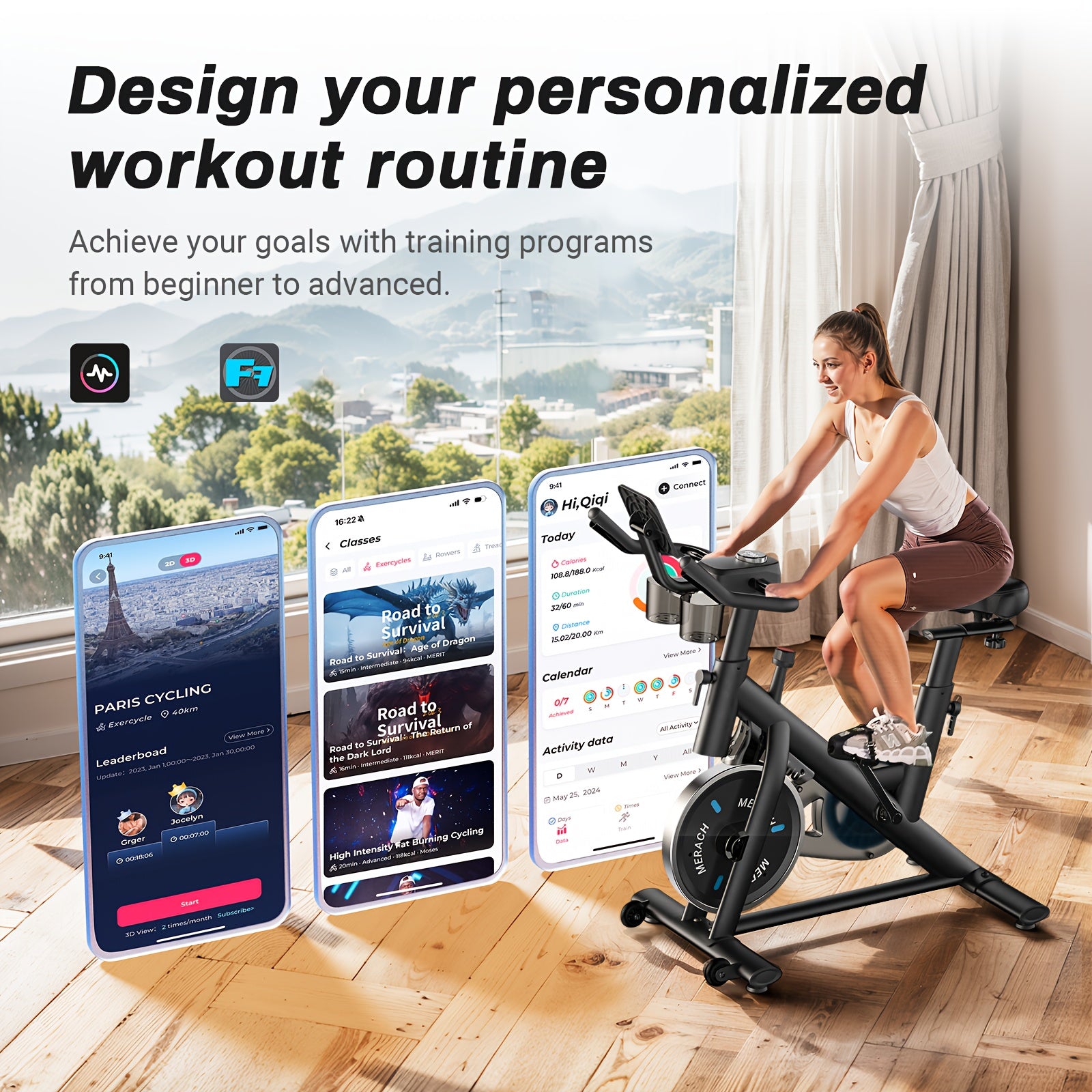 MERACH Exercise Bike, Brake Pad Stationary Bike With Exclusive App, Low Noise Indoor Cycling Bike With 300lbs Weight Capacity, Tablet Mount And Fitness Courses For Weight Loss