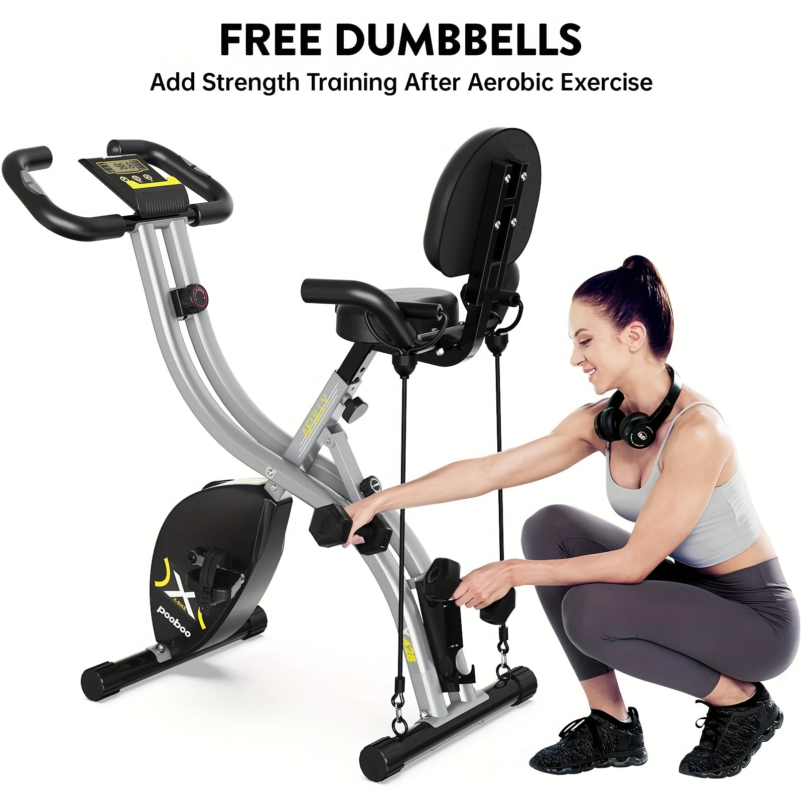 Pooboo Folding Exercise Bike Indoor Stationary Cycling Bicycle Upright Magnetic Workout Bicycle with Dumbbells and Resistance Bands Maximum Weight 300 Pounds Without Battery